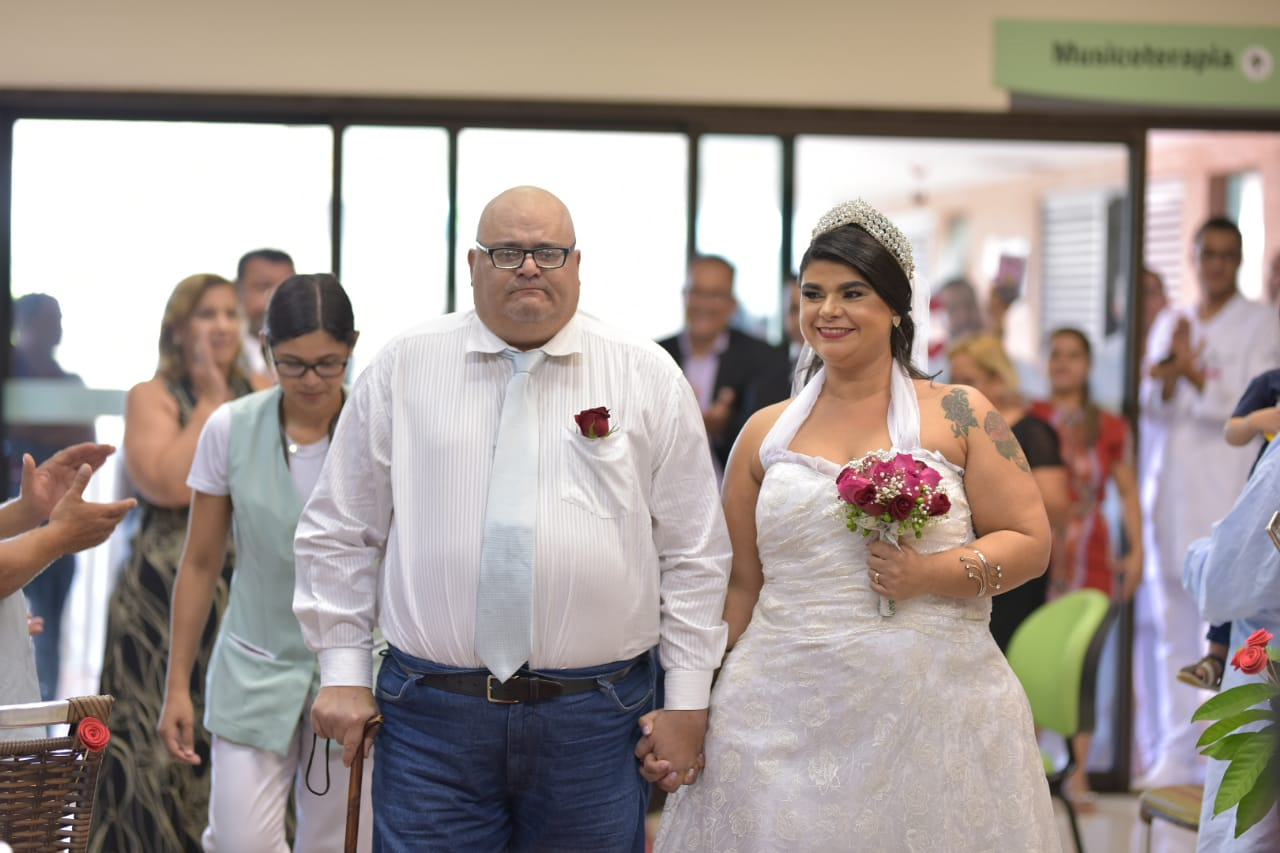 Juntos há mais de 10 anos, porém, sem nunca terem oficializado o matrimônio em uma cerimônia religiosa, os dois viveram momentos de felicidade e muito romantismo no último dia 5 de março. Ao saber do desejo do casal, a equipe multidisciplinar do hospital logo começou a organizar os preparativos, contatar os parceiros e, em apenas cinco dias, estava tudo pronto! “Essa festa foi a realização de um sonho, não apenas para o casal, mas para nós também. Quando eles nos contaram sobre esse desejo, nós fizemos de tudo para que fosse realizado da maneira mais linda e inesquecível possível para eles”, explicou a assistente social da unidade, Desiane Pereira.