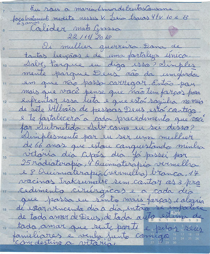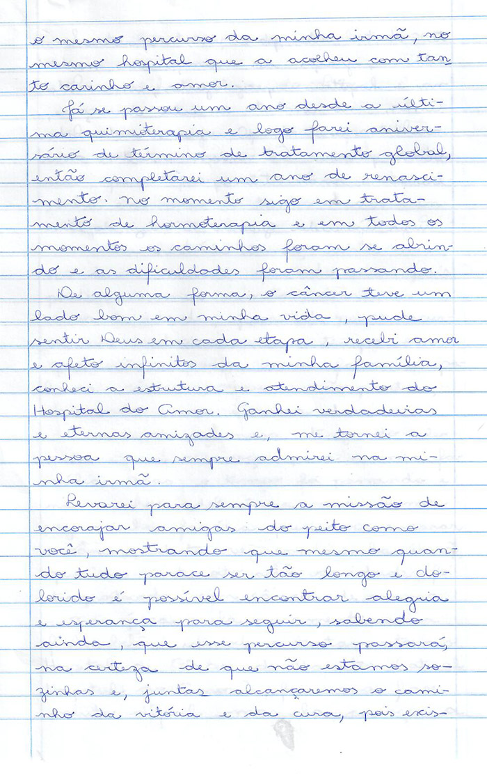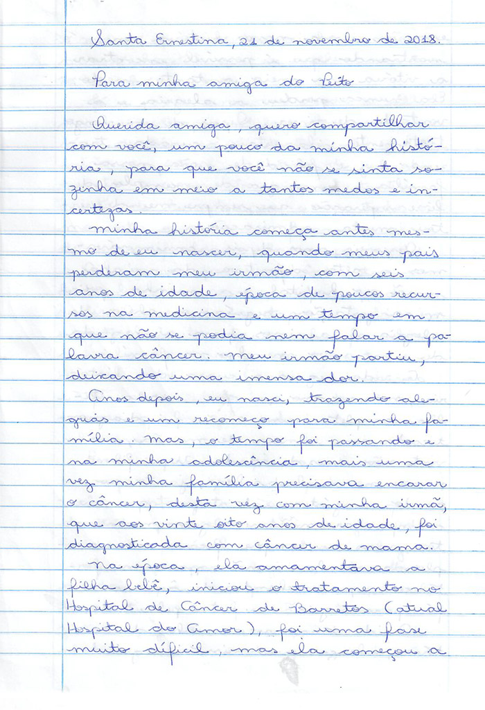 Contando suas histórias de superação e encorajando as outras pacientes a enfrentar a luta contra o câncer de mama, as participantes (mulheres que realizam ou realizaram tratamento há mais de dois anos no HA) tinham uma missão: escrever uma carta à mão, demonstrando momentos, situações e sentimentos que trouxeram força e coragem para seguir a batalha, e que servissem de inspiração para aquelas que estão iniciando o tratamento.